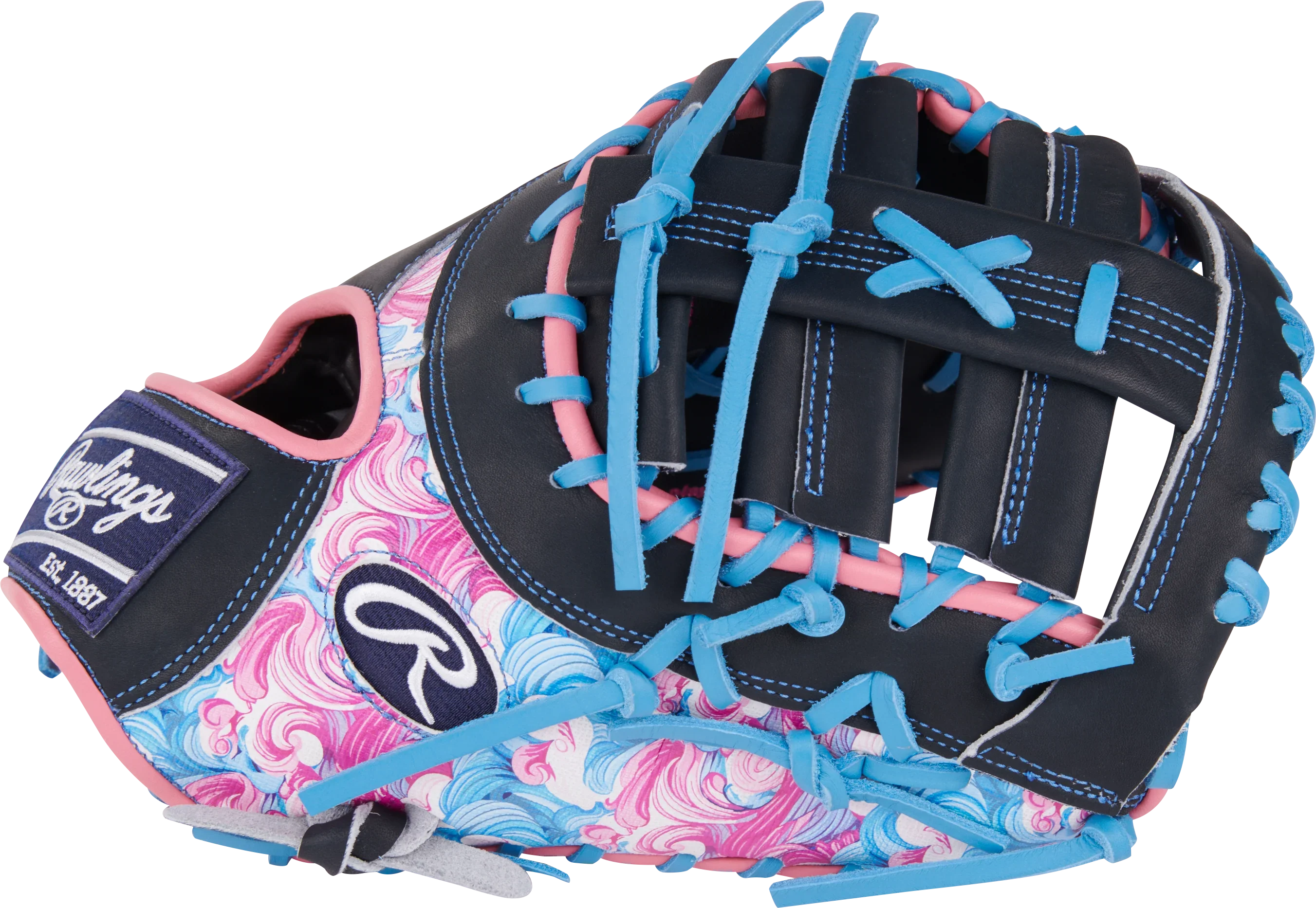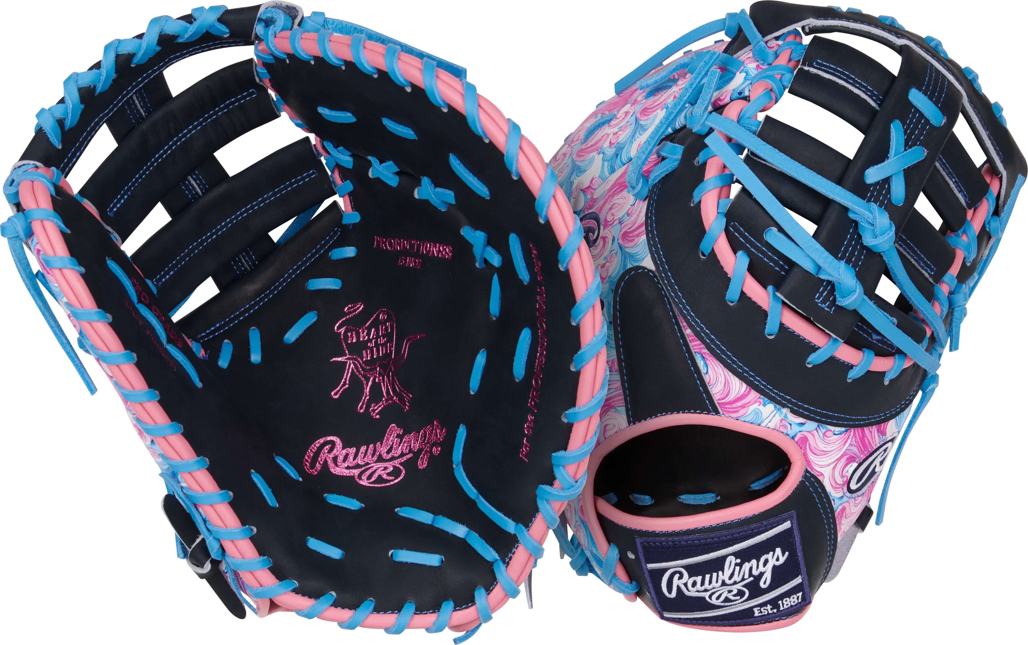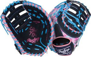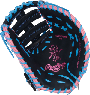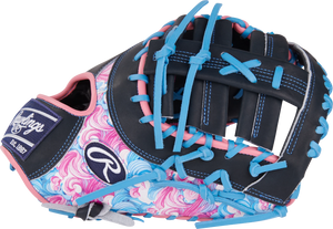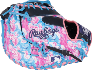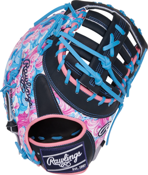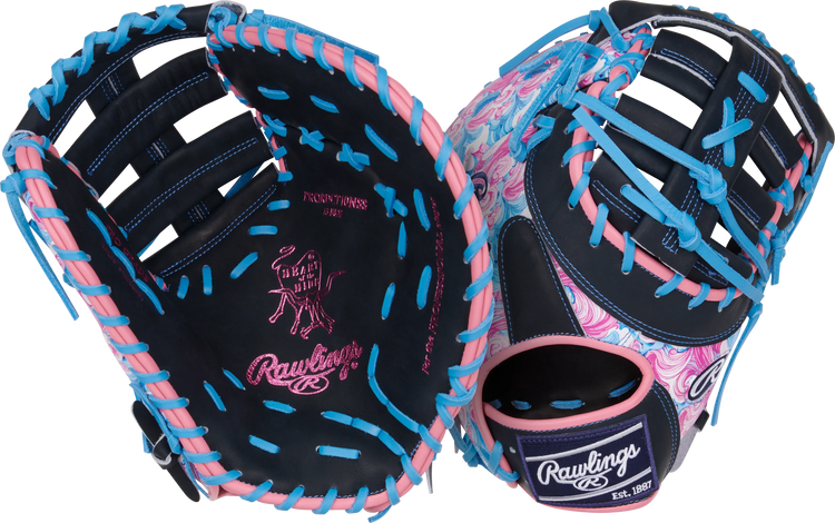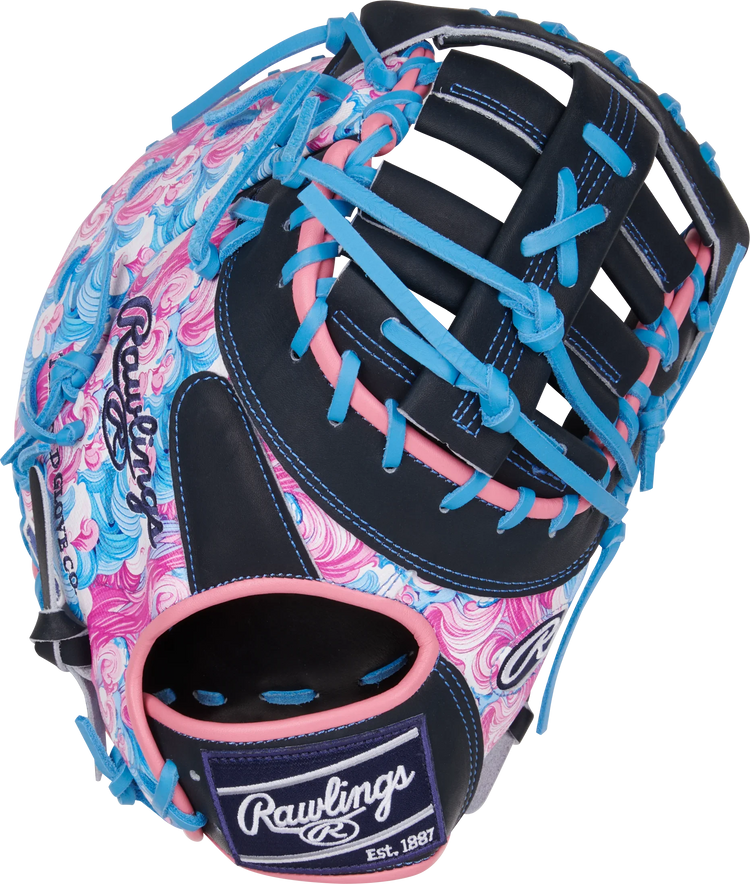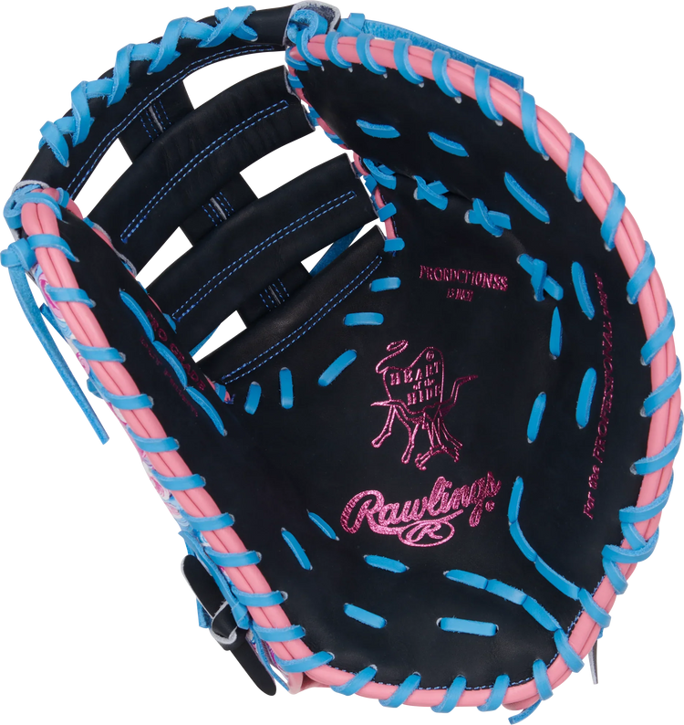 Get ready to dominate the diamond with this 13-inch Rawlings Heart of the Hide ColorSync first baseman mitt! The bold wave-inspired design in vibrant pink, blue, and black tones, along with the matching blue foil stamp and Rawlings patch, make this mitt a standout on the field. Crafted from high-quality Heart of the Hide leather and pre-treated for a faster break-in, this mitt offers the perfect combination of durability and performance. First basemen will appreciate the deep pocket and 13-inch size, providing the control and security needed for quick scoops and lunges at the bag. Don't wait any longer, elevate your game with the Rawlings 13-inch Rawlings Heart of the Hide Colorsync first baseman mitt today!